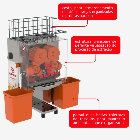 O Extrator Juice Express Braesi BEL-20 une a robustez do acabamento em aço inox com a potência necessária para o dia a dia de estabelecimentos que demandam sucos frescos com rapidez, facilitando a organização e a higiene do seu setor de bebidas. Este modelo é a solução ideal para quem busca produtividade, permitindo a extração máxima de suco de laranjas e limões com o mínimo de esforço e desperdício.