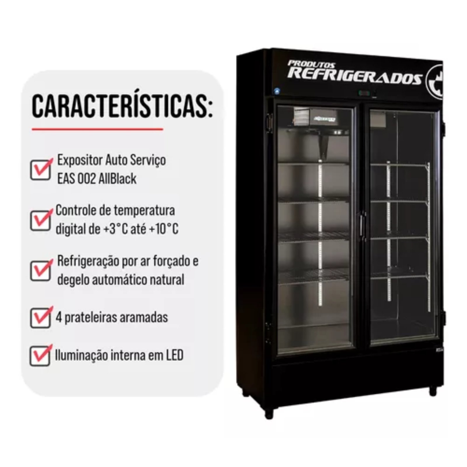 Diferente de expositores brancos tradicionais, o EAS-002 SE All Black conta com um sistema de Refrigeração por Ar Forçado (Frost Free), assegurando que o frio seja distribuído de forma rápida e uniforme em todas as prateleiras. Suas grades aramadas pretas são reguláveis e reforçadas, permitindo que você personalize o layout interno para acomodar desde latas e long necks até garrafas maiores e potes de laticínios com total praticidade e estilo.