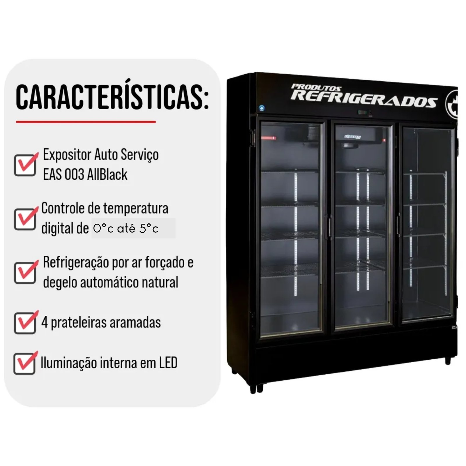 Diferente de expositores brancos tradicionais, o EAS-003 SE All Black conta com um sistema de Refrigeração por Ar Forçado (Frost Free), assegurando que o frio seja distribuído de forma rápida e uniforme em todas as prateleiras. Suas grades aramadas pretas são reguláveis e reforçadas, permitindo que você personalize o layout interno para acomodar desde latas e long necks até garrafas maiores e potes de laticínios com total praticidade e estilo.