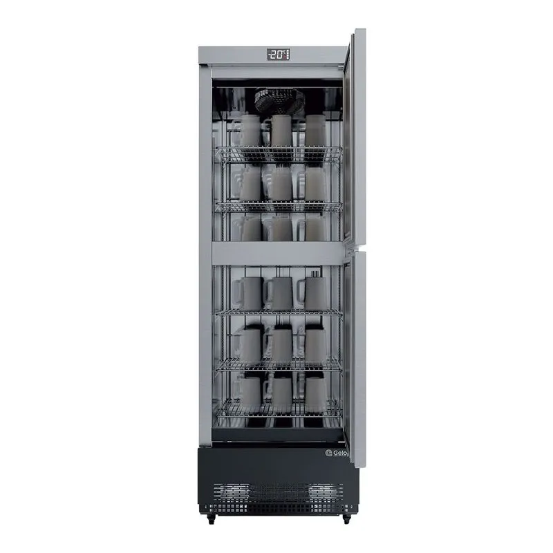 O Gela Canecas Gelopar GGC-57 TI une a robustez da linha Esmeralda com a tecnologia necessária para o dia a dia de bares, choperias e áreas gourmet, facilitando a organização e a higiene do seu estoque de vidros. Com uma generosa capacidade de 578 litros, este modelo é a solução ideal para quem busca o “efeito “véu de noiva””: seu sistema de refrigeração potente permite congelar rapidamente canecas e copos, garantindo que o chope ou a cerveja permaneçam gelados por muito mais tempo no paladar do cliente.