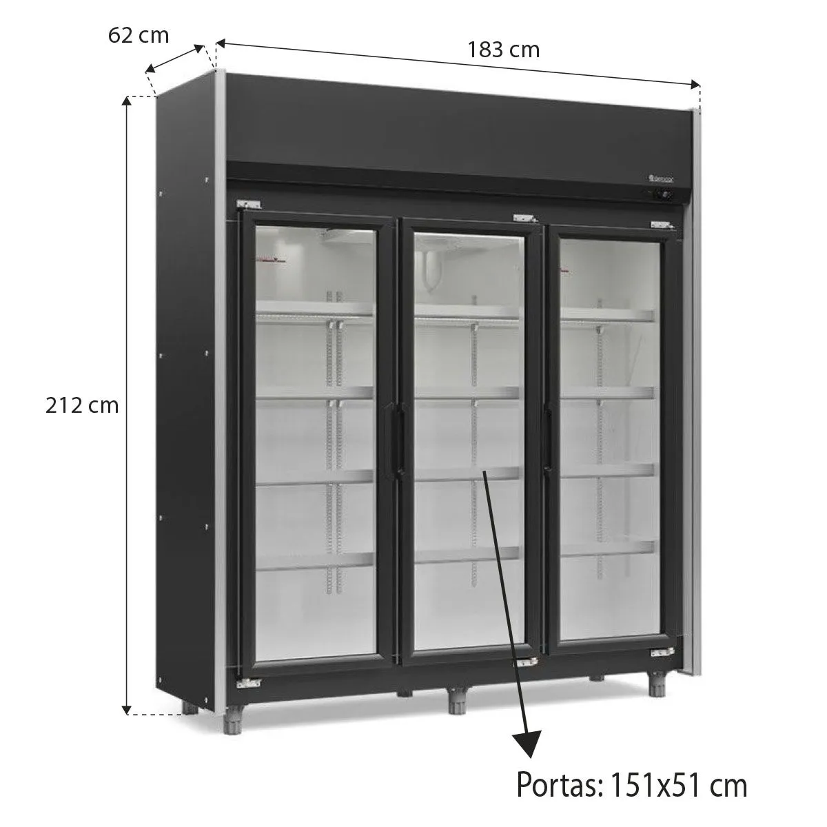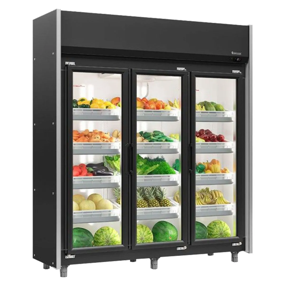 Por possuir Vidros Duplos Temperados com Gás Argônio, este modelo oferece uma excelente isolação térmica e redução da condensação externa, sendo perfeito para locais que buscam eficiência energética e uma visão sempre nítida das mercadorias. O acabamento interno e externo em preto confere um design sofisticado e moderno, que destaca as cores das embalagens sob a iluminação interna em LED, impulsionando o desejo de compra.