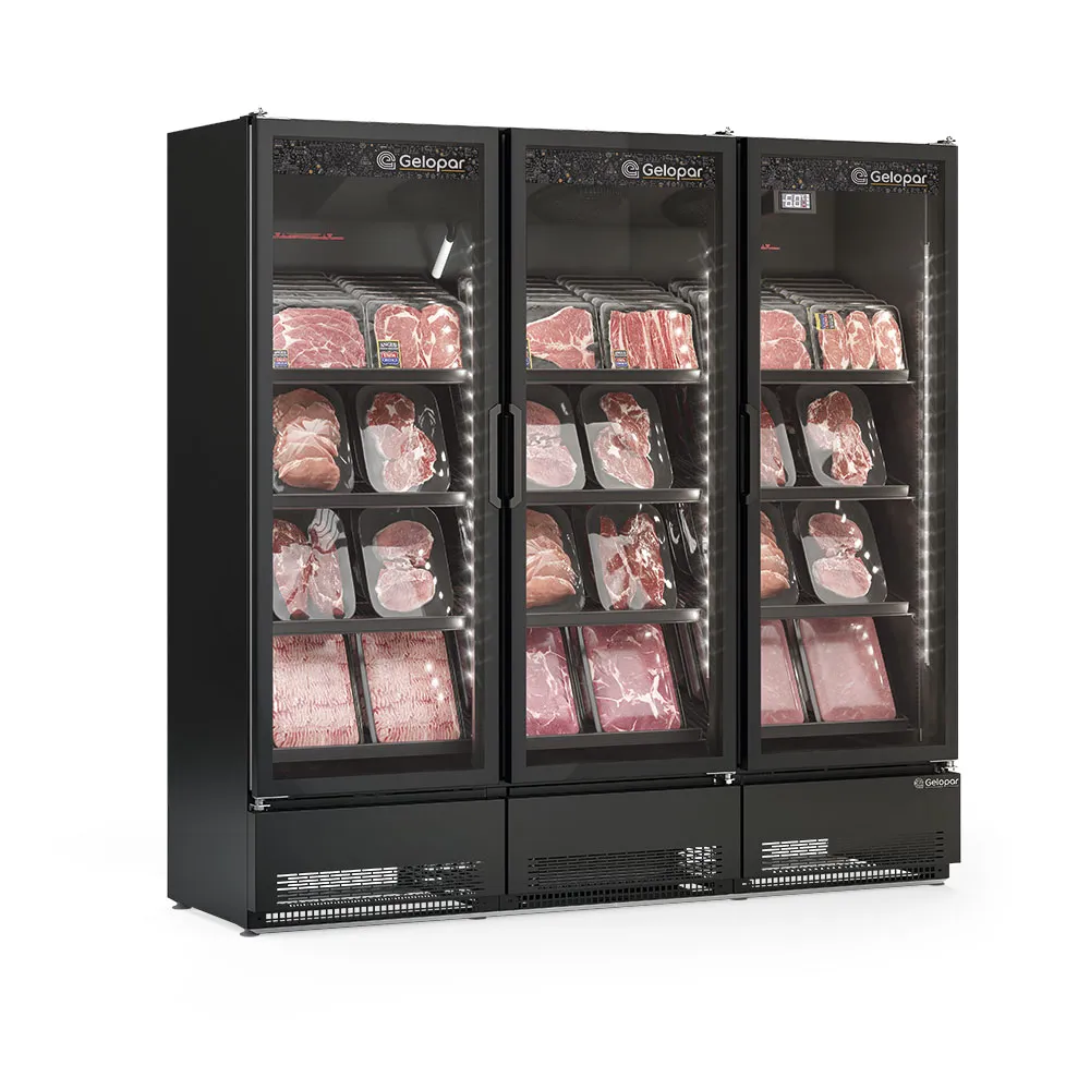 O Expositor Gelopar GCBC-1450 CB faz parte da linha Carbon (CB), que traz o acabamento All Black (preto externo e interno) para um nível superior de sofisticação e durabilidade. Este modelo de 3 portas é a solução definitiva para conveniências e casas de carnes que buscam versatilidade: seu sistema de refrigeração é dimensionado tanto para manter cervejas “trincando” quanto para a conservação segura de carnes resfriadas, garantindo que o seu produto principal esteja sempre na temperatura perfeita.