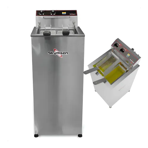 Diferente de fritadeiras convencionais, a FAP-8 da Skymsen é construída com materiais de padrão industrial e possui resistências blindadas de alto rendimento. Seu design funcional inclui um dreno frontal para facilitar a troca da solução salina e a limpeza profunda, garantindo que o equipamento esteja sempre pronto para o próximo turno com o máximo de segurança alimentar.