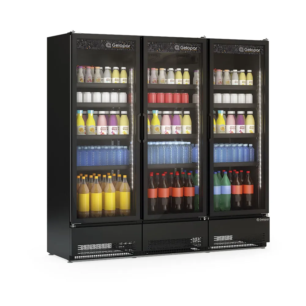 O Refrigerador Gelopar GCVR-1450 CB faz parte da prestigiosa linha Carbon (CB), que traz o acabamento All Black (preto interno e externo) para um nível superior de elegância e durabilidade. Com suas 3 portas, este gigante da refrigeração oferece uma vitrine monumental, sendo a solução definitiva para conveniências, empórios e supermercados que buscam centralizar sua linha de bebidas, sucos e laticínios com uma estética moderna que valoriza o ponto de venda.