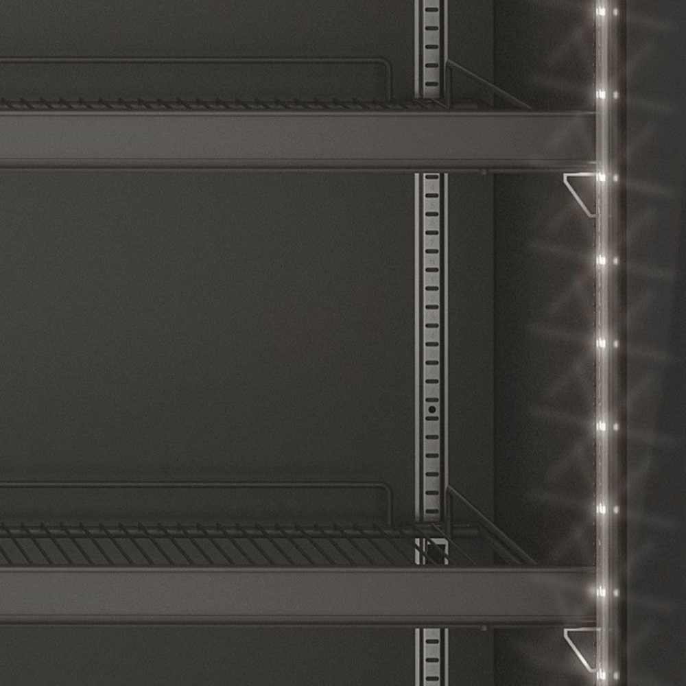 Por possuir Vidros Duplos Temperados de Baixa Emissividade, este modelo oferece uma excelente manutenção térmica e eficiência energética, sendo perfeito para locais que buscam reduzir o consumo de eletricidade sem abrir mão de uma vitrine sempre nítida. O conceito Carbon cria um fundo infinito preto que, aliado à iluminação em LED, faz com que os rótulos dos produtos se destaquem com um contraste vibrante, incentivando a compra por impulso.